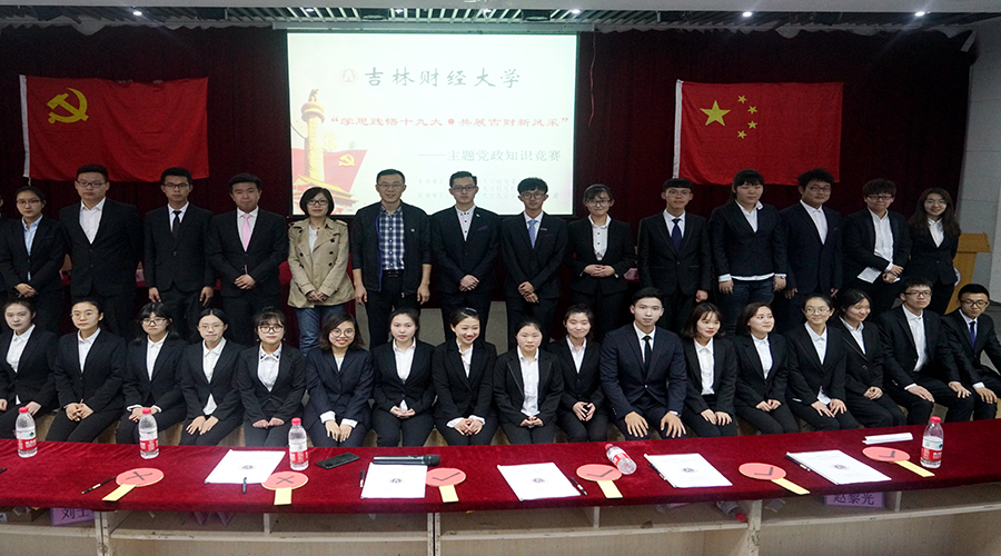 本网讯(统计学院 张嘉纯)为深入学习宣传贯彻党的十九大精神,推进“两学一做”学习教育常态化制度化,不断加强党的思想政治建设,4月20日晚,党委组织部、党校联合统计学院党总支在第一教学楼1101报告厅共同举办了“学思践悟十九大,共展吉财新风采”主题党政知识竞赛。统计学院党总支书记曲晓东、党委组织部副部长兼党校副校长薛媛、统计学院党总支副书记孙成伟、会计学院团委书记王萌、九台农商银行金融学院团委书记刘士明、税务学院团委书记赵黎光、管理科学与信息工程学院曲放老师等出席了本次主题党政知识竞赛。