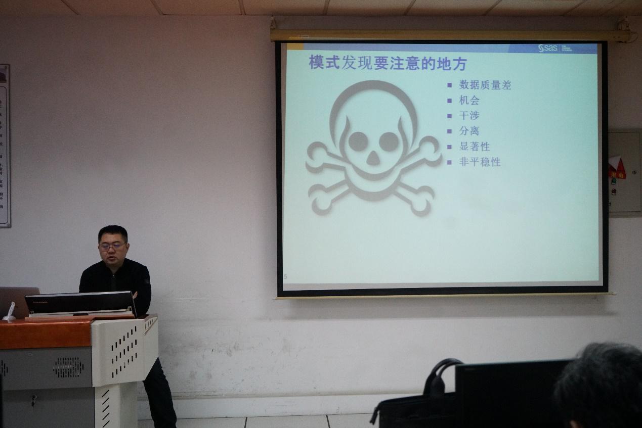 培训开始,邵朱明教授向大家介绍了补缺失值的方法,并用具体操作向大家依次介绍了如何用最小二乘法筛选变量、模型回归的分析方法以及神经网络的概念。为了使大家能够更好的理解,邵朱明教授以图文并茂的方式进行授课,生动形象地为大家讲解枯燥难懂的专业理论概念。接下来,他向大家强调了评分数据模型的方法,同时他还提及了探索性分析包括聚类分析和购物篮分析、序列分析用于状态分析检测等相关知识。相比于第一次培训,此次培训更加注重专业知识的讲解以及实践性的操作,极大地丰富了学生的专业技能。