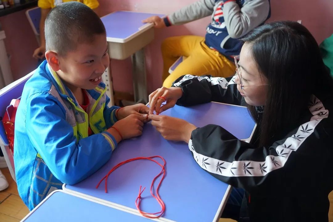 长长的丝线,编出的是我们志愿者对孩子的期盼和祝福。一个个不算精美的工艺品,是孩子们生涩的实践和我们志愿者完全的付出。也许时间很短暂,但我坚信在这短暂的时间里,我们有了一次心灵间的交流。每一朵花都有它绽放的时间和季节,我相信这些孩子会找到他们绽放的最美时刻。
