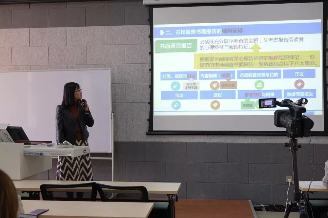 为培养我校学生在市场调查报告文本撰写与现场展示方面的实践能力,增强学生参与市场调查大赛的竞争力,2019年4月10日下午三点半,在逸夫教学楼2211教室,统计学院张廷廷老师为同学们做了市场调查报告文本撰写与现场展示的报告。