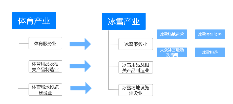 冰雪产业是在冰雪资源开发的基础上形成的特殊资源型产业,覆盖范围广,产业链庞大。结合国家对体育产业的划分对我国冰雪产业进行划分,包括冰雪服务业、冰雪用品及相关产品制造业和冰雪场地设施建设业三大类。其中,冰雪服务业是冰雪产业的核心,主要包括冰雪场地运营、冰雪赛事服务、大众冰雪运动及培训、冰雪旅游等。