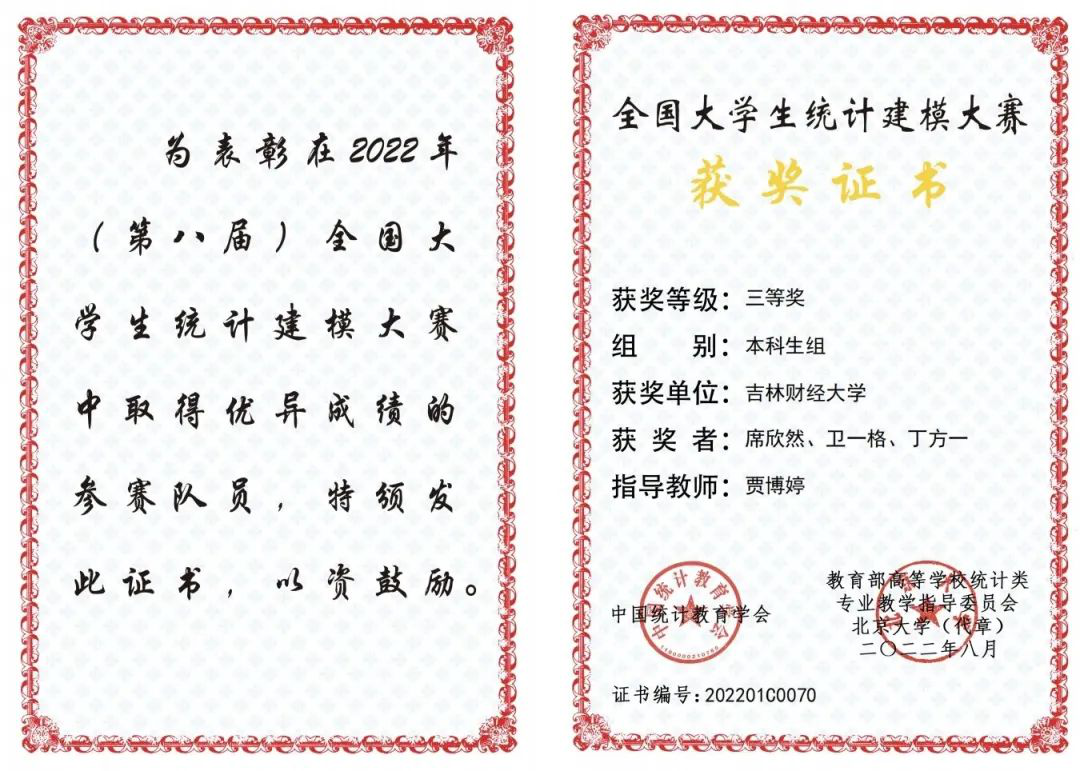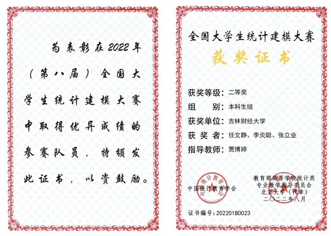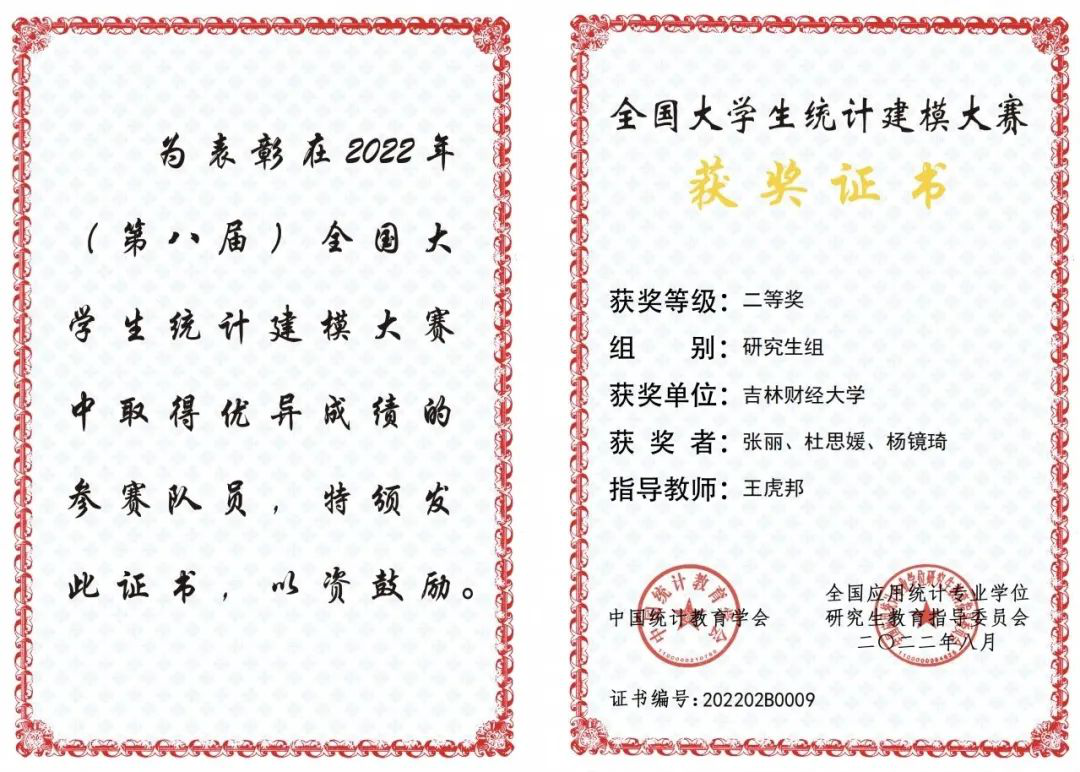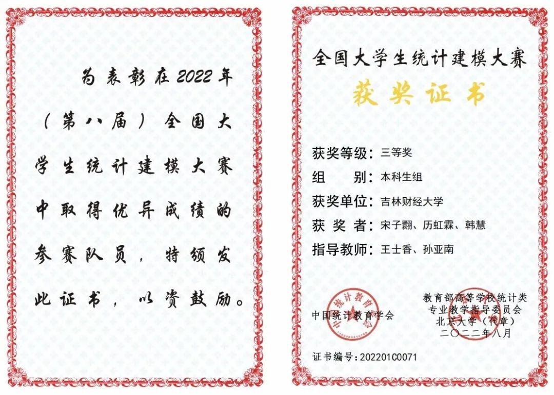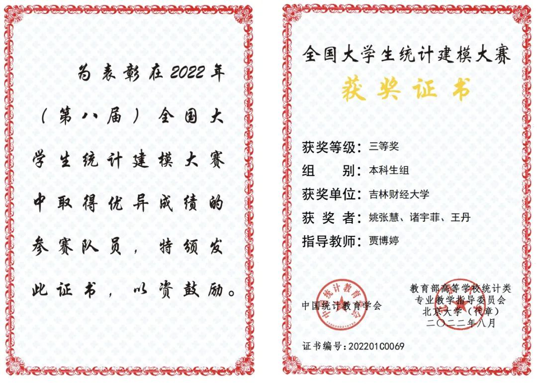 2022年在统计建模大赛中,我校的32支队伍在省赛中有30支队伍获奖,获奖率高达93%,而且有10支队伍入选国赛,取得了国家二等奖2项、国家三等奖8项的成绩!