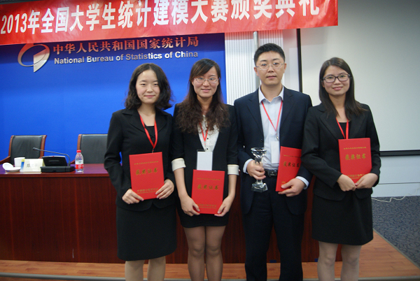 本次大赛评委由中国人民大学博士生导师吴喜之教授等国内一流统计专家组成。在最后决赛阶段,由八个队角逐一等奖,我校同学凭借扎实的理论基础和优异的表现获得专家组的一致好评,最终获得一等奖!