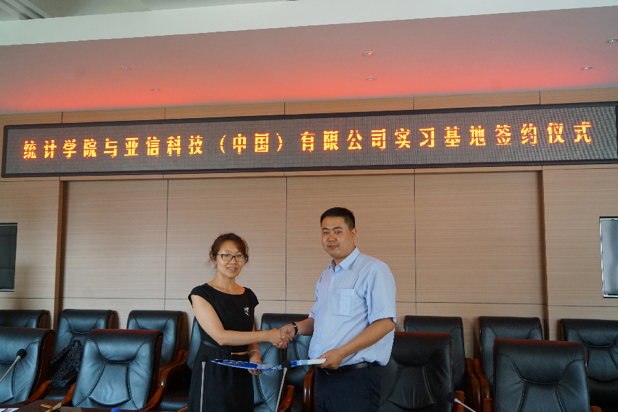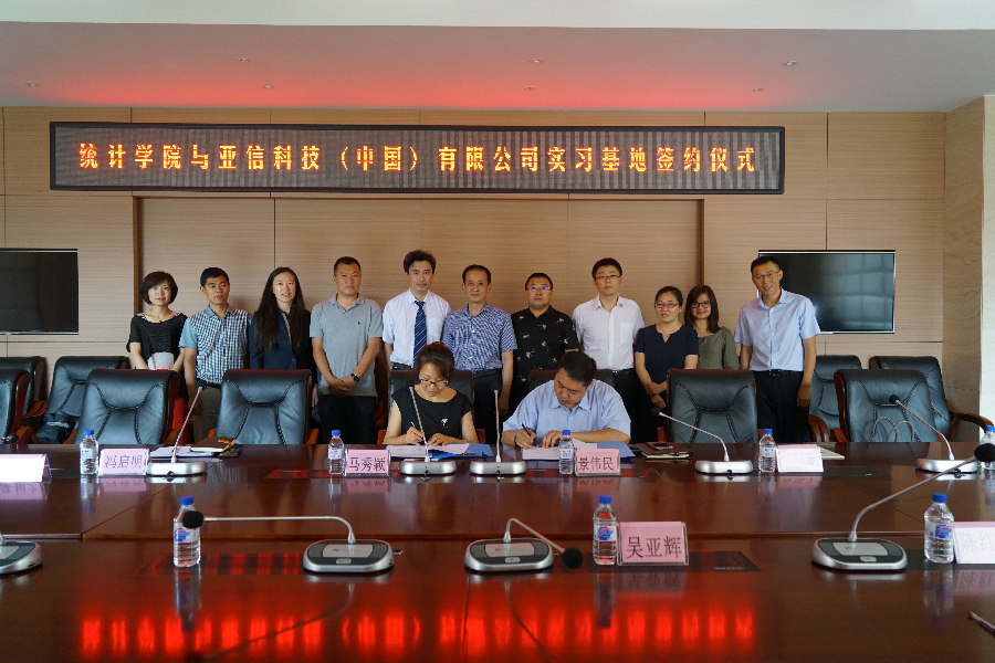 2017年6月29日,统计学院于综合楼第一会议室举行与亚信科技有限公司实习基地的签约仪式。亚信公司华北高级客户经理景伟民、华北高级项目经理冯启明、资深技术经理吴亚辉、吉林资源经理陈红旭和资深技术经理王宇莅临此现场。统计学院院长马秀颖、党总支书记曲晓东、副院长陈知之、副院长李国荣、党总支副书记孙成伟、团委书记郭妍、教研室主任邓秉德、李学代表统计学院出席本次签约仪式。