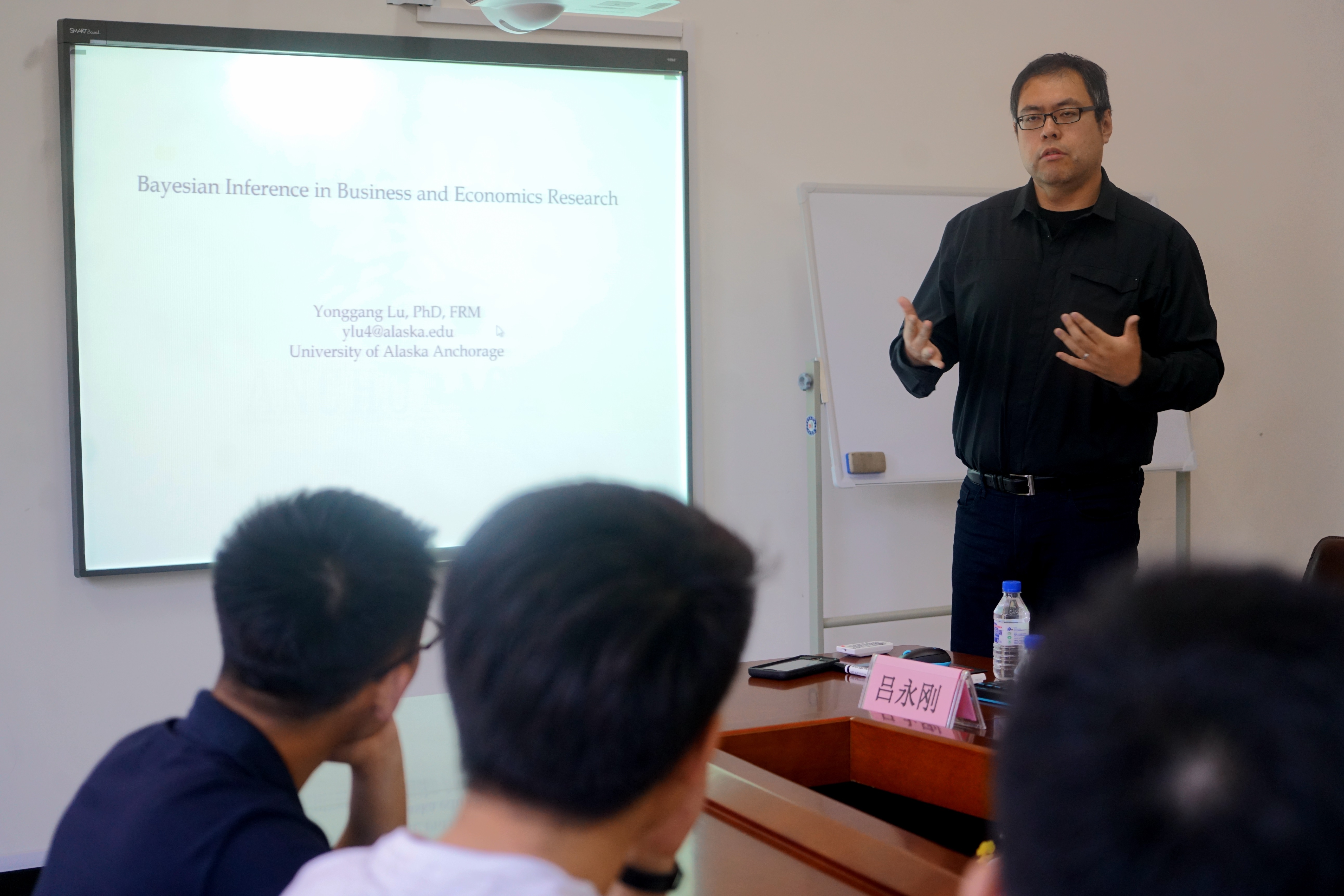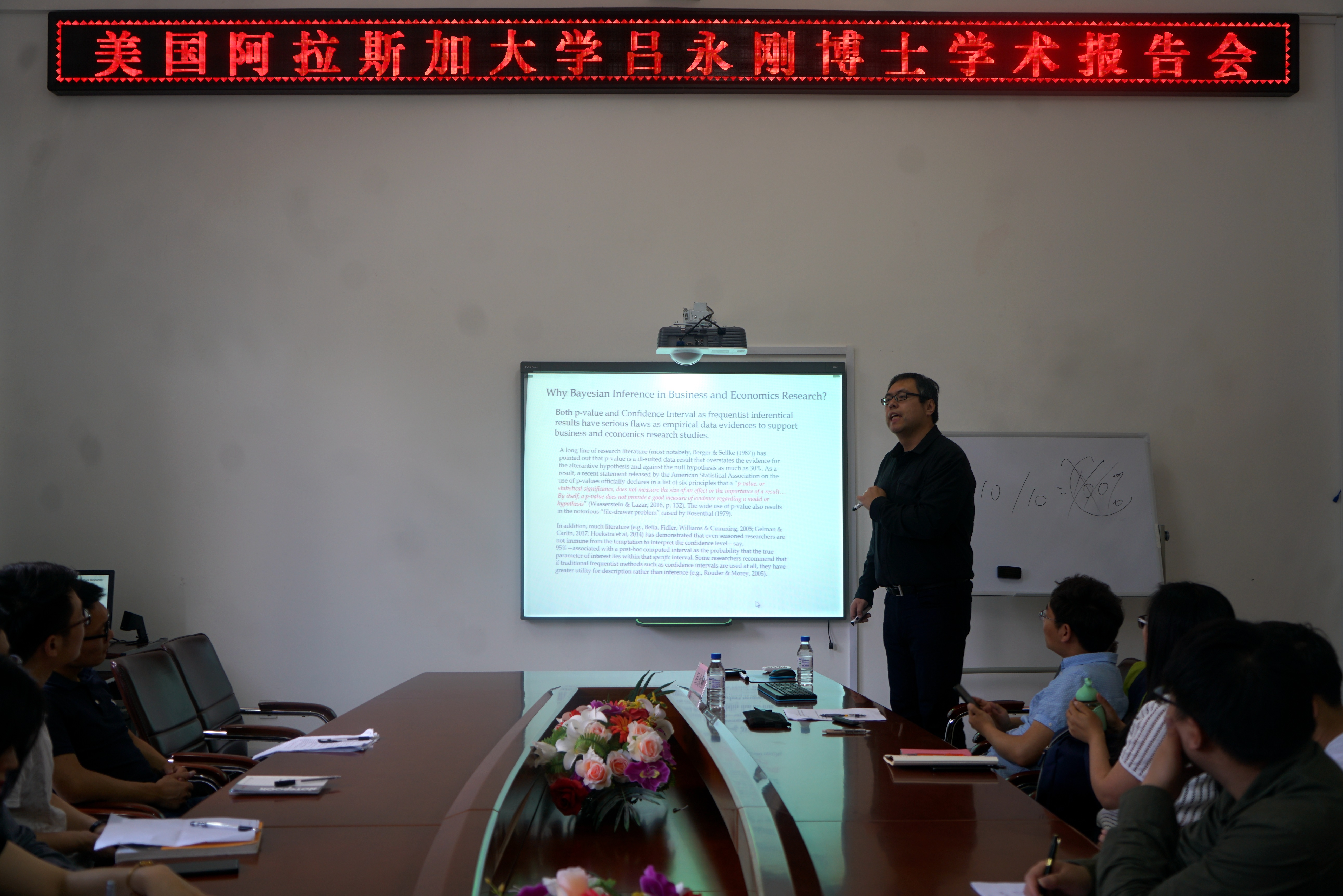 本网讯(统计学院 供稿)6月8日上午,应统计学院与国际合作与交流处的邀请,美国阿拉斯加大学安克雷奇分校(University of Alaska Anchorage)信息系统与决策科学学院(College of Business and Public Policy),吕永刚博士(Yonggang Lu, PhD)于综合楼145会议室作了"商学研究中的贝叶斯推论"(Bayesian Inference in Business Research)为主题的学术报告,国际合作与交流处和统计学院的全体老师以及研究生参加此次报告会。统计学院李晓新老师主持此次会议。