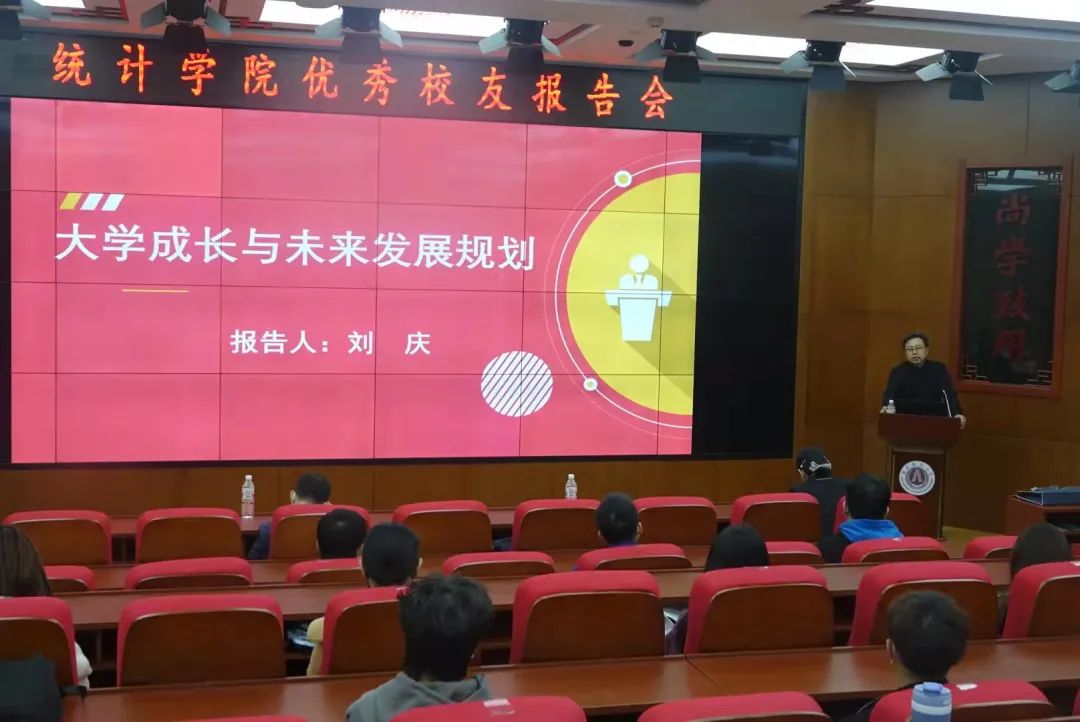 为引领大学生成长成才,加强研究生职业规范教育,推动专业素质教育内涵建设,统计学院优秀校友著名作家刘庆应我校邀请,于10月24日下午2:00和10月26日上午9:30分别在综合楼145会议室和第一教学楼1202报告厅为研究生和本科生做了“研究生职业规划与职业发展建议”,“大学成长与未来发展规划”两场主题报告。校党委宣传部副部长郭建辉、统计学院部分老师,以及研究生和本科生代表参加了此次报告会。报告会由统计学院党总支书记蒋武鹏主持。