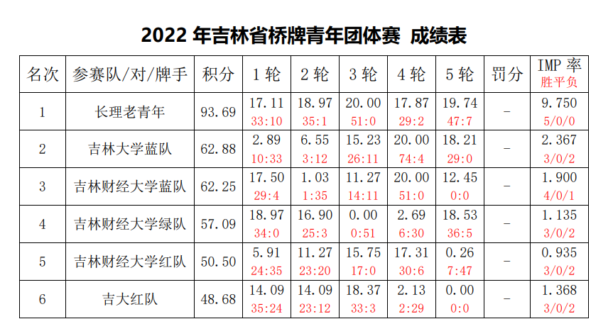 在10月2日刚刚结束的2022年吉林省桥牌青年锦标赛中,我校和来自吉林大学、长春理工大学、北华大学的12支代表队经过5轮同台竞技,我校三个代表队分别以总积分位列第三、四、五名。