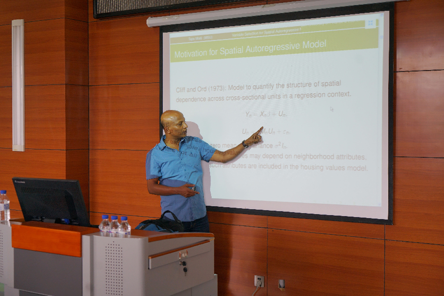 Maiti教授首先从两幅图入手,引导师生思考,从中抽象出一个空间矩阵,引出他本次报告的重要模型——Spatial Autoregressive Model(空间自回归模型)。空间自回归模型主要解决线性回归分析中空间依赖关系的相关问题。Maiti教授介绍了空间自回归模型的形式、特点及应用,并给出通过对最小二乘估计加入罚约束,使某些系数的估计为0的lasso回归方法的优势与原理。在整个报告过程中,Maiti教授都十分注重与现场师生的实时交流互动,他生动活泼的讲解使得现场交流气氛十分活跃。