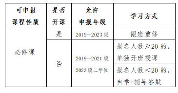 本学期开课课程:采取跟班重修方式进行学习,学生需要自己查询全校课表,并选择相应班级跟班学习,如果上课时间冲突,也可以采用自学+辅导答疑的方式进行学习。