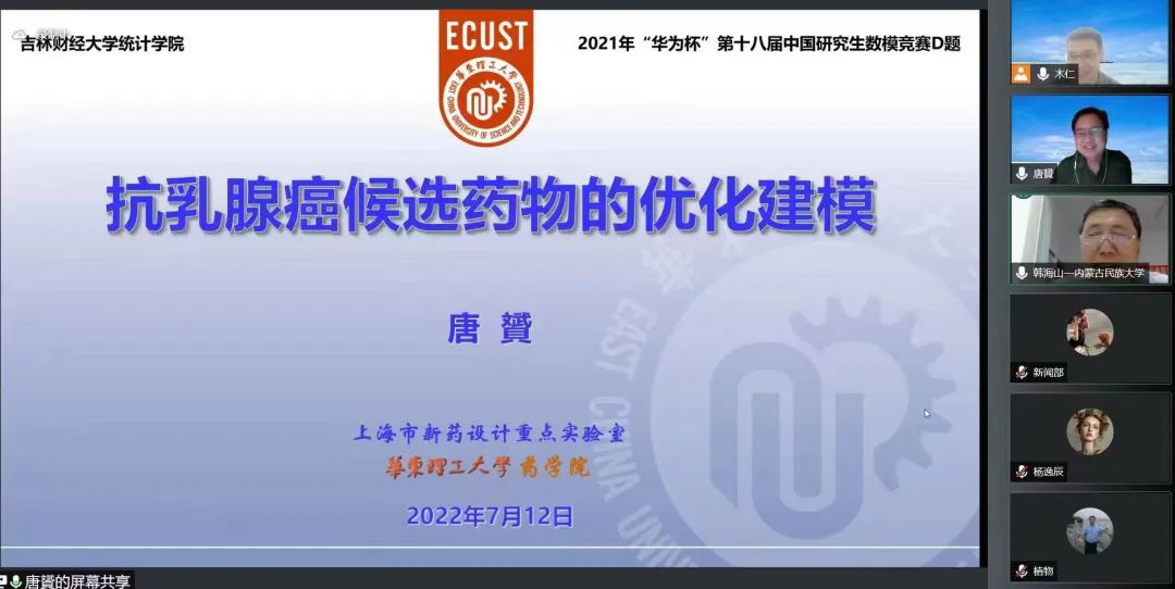 为了拓展广大老师和学生们的知识领域,提高建立数学模型和运用互联网信息技术解决实际问题能力,应我校统计学院的邀请,华东理工大学唐贇教授作了题为“抗乳腺癌候选药物的优化建模”报告,报告于7月12日晚在腾讯会议召开。学院青年教师和研究生参加了报告会,会议由经济运行研究中心主任木仁教授主持。