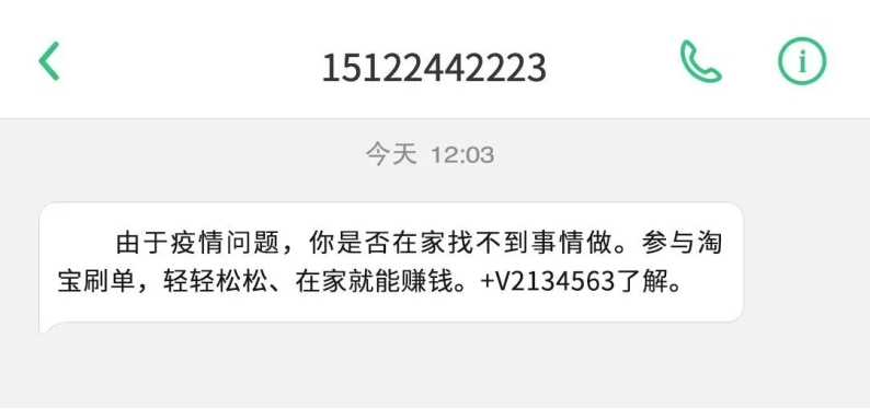 由于疫情原因,部分同学希望通过线上渠道增加收入来源。诈骗分子利用各大社交平台、短信等方式散发兼职广告,称可以通过刷单赚外快,工资日结,诱导群众到指定网络平台上购买物品刷单,在受害者不断投入本金后,拒不退款,骗取钱财。