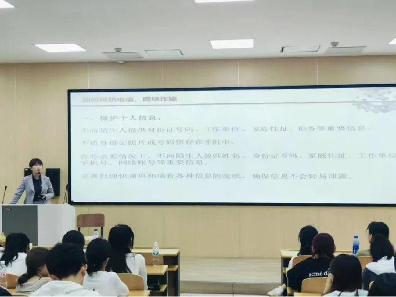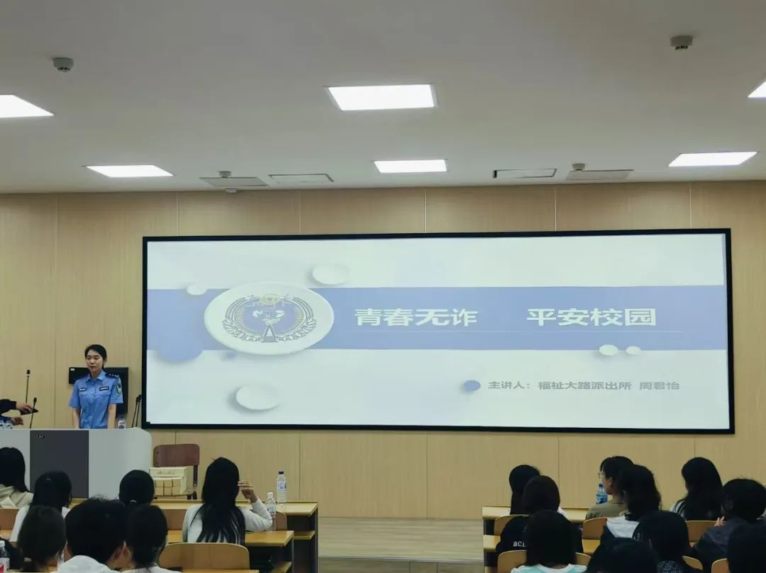 来自福祉大路派出所的周君怡警官为同学们揭秘了一些常见的诈骗手段,并用一些真实的案例向同学们讲述受到诈骗的危害。